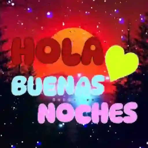 Uma saudação noturna com o texto 'HOLA BUENAS NOCHES' em letras coloridas sobre um fundo estrelado com uma lua alaranjada e um coração amarelo.