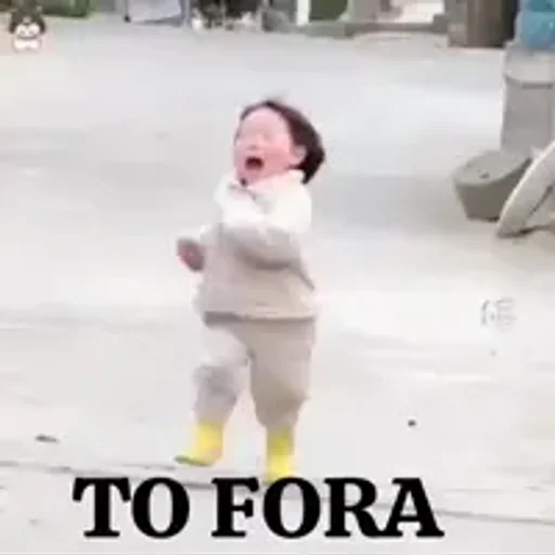 Um bebê com expressão de choro, vestindo um conjunto bege e meias amarelas, com o texto 'TO FORA' em letras pretas.