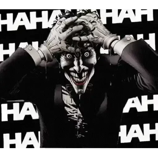O Coringa com as mãos na cabeça, olhos arregalados e boca aberta em um sorriso maníaco, com 'HAHAHA' repetido ao fundo.