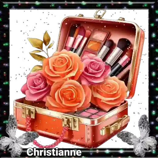 Maleta de maquiagem rosa com rosas e pincéis, 'Christianne' embaixo.