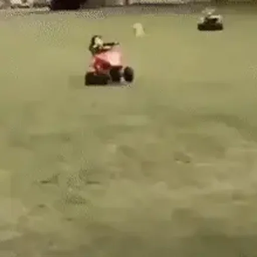 Um menino em uma quadriciclo vermelho dirige em uma área arenosa, com outro veículo ao fundo.