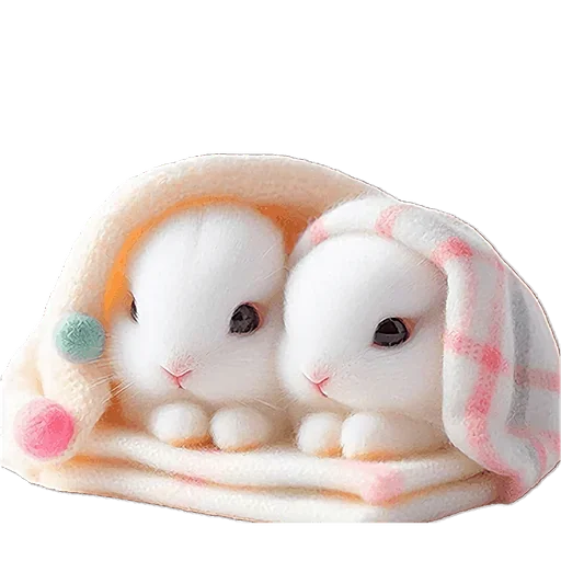 Dois coelhos brancos fofos estão sentados lado a lado, envoltos em cobertores coloridos. Eles têm olhos grandes e…