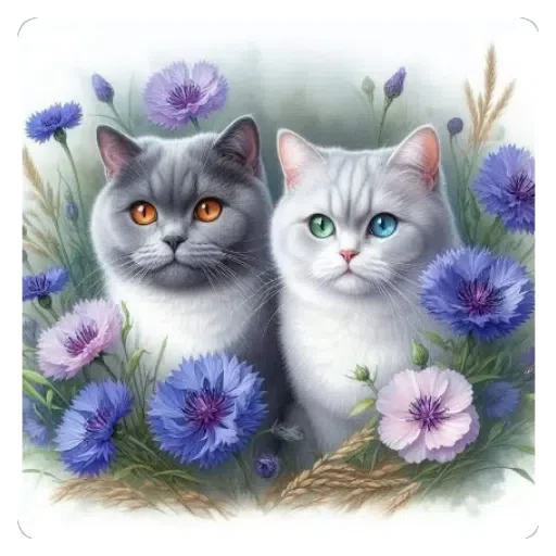 Dois gatos, um cinza com olhos laranja e outro branco com olhos azuis, sentados lado a lado em meio a flores roxas e azuis.