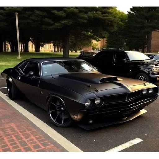 Um carro preto com detalhes em roxo, estilo muscle car, estacionado em uma vaga de estacionamento com outro carro ao…
