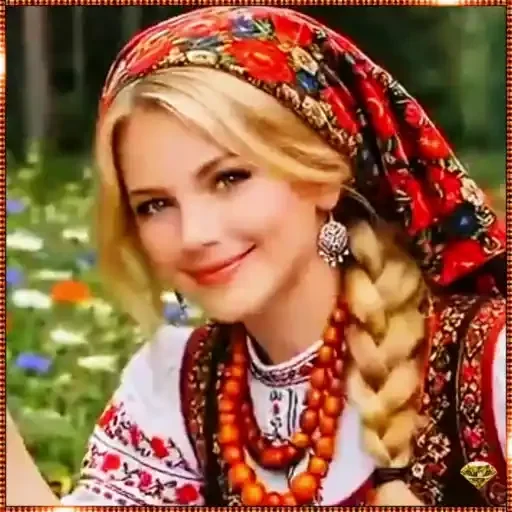 Uma jovem mulher loira com trança e adornos coloridos na cabeça e pescoço, vestindo uma blusa branca com detalhes em vermelho e laranja, sorrindo suavemente.