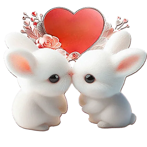 Dois coelhos brancos se beijando, com um coração vermelho e flores rosadas ao fundo.