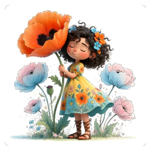 Menina com cabelos castanhos e curtos, vestida com um vestido amarelo e azul com flores laranjas, segura uma grande flor laranja. Ela está rodeada de flores azuis e rosadas.