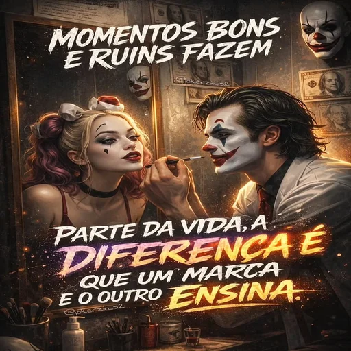 Uma imagem de Joker e Harley Quinn em frente a um espelho, com Joker aplicando maquiagem. A imagem contém os textos 'MOMENTOS BONS E RUINS FAZEM PARTE DA VIDA. A DIFERENÇA É QUE UM MARCA E O OUTRO ENSINA.'