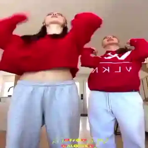 Duas mulheres vestidas com blusas vermelhas e calças cinzas dançando, com os braços levantados. Há um fundo que parece uma cozinha.
