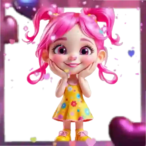 Menina de cabelo rosa em pigtails, vestindo um vestido amarelo com flores, com as mãos no rosto e um sorriso. Círculos e corações coloridos ao redor.
