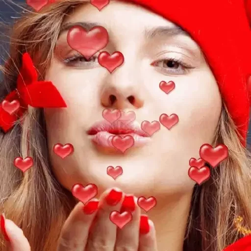 Uma jovem mulher com cabelos loiros e um gorro vermelho faz uma careta engraçada com os olhos fechados e a língua para…