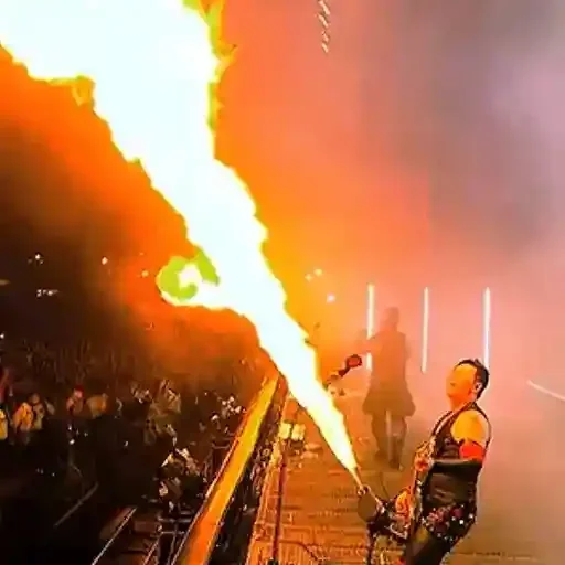 Um homem em um palco está segurando um lança-chamas, com uma grande chama saindo dele. Ele está usando um colete preto e calça jeans.