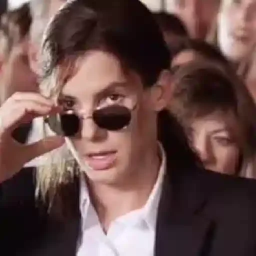 Homem de terno e óculos escuros, tocando nos óculos com a mão, com pessoas ao fundo.