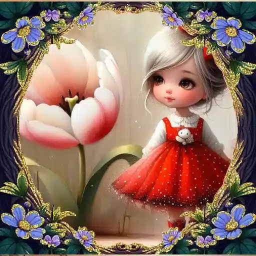 Menina de cabelo grisalho e vestido vermelho ao lado de uma tulipa rosa, emoldurada por flores azuis e amarelas.