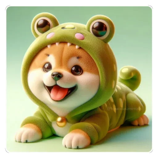 Um cachorro fofo vestindo um macacão verde de sapo, com olhos castanhos e língua para fora, em um fundo verde claro.