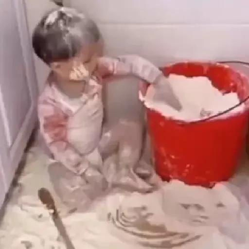 Um bebê sujo de farinha, sentado ao lado de um balde vermelho cheio de farinha, com uma colher ao lado.
