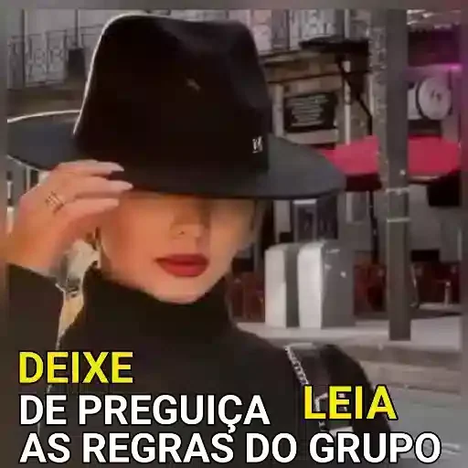 Mulher loira usando um chapéu preto e um casaco preto, tocando o chapéu com a mão direita. A imagem tem o texto 'DEIXE DE PREGUIÇA LEIA AS REGRAS DO GRUPO' em letras amarelas e brancas.