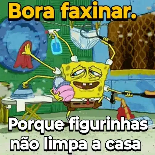 Bobby de esponja com expressão de desânimo, segurando vários objetos de limpeza. Ele está com uma vassoura e um pano na mão e tem um texto amarelo 'Bora faxinar' e branco 'Porque figurinhas não limpa a casa'.