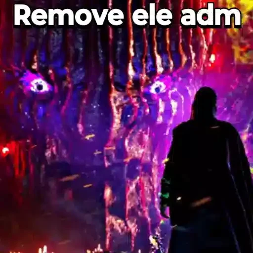 Um homem de pé diante de uma entidade ou criatura misteriosa com olhos brilhantes, em um ambiente escuro e colorido. O texto 'Remove ele adm' aparece na parte superior.