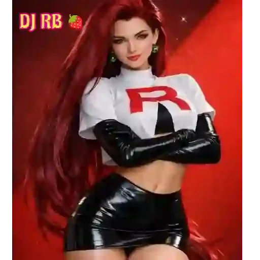 Uma mulher com cabelo vermelho longo e uma roupa preta e branca com a letra 'R' vermelha no peito, semelhante a um uniforme de ginástica, com o texto 'DJ RB' no canto superior esquerdo.