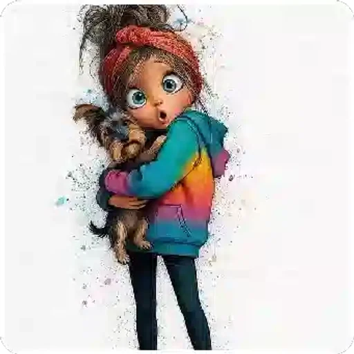 Menina abraçando um cachorro, usando uma bandana vermelha na cabeça e uma blusa colorida. O cachorro é castanho e preto.