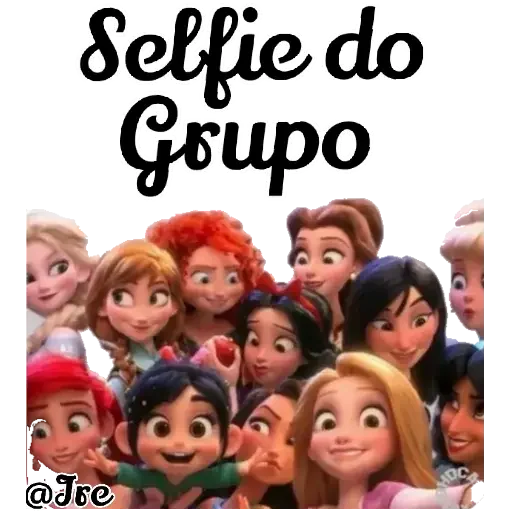 Um grupo de personagens de desenho animado tirando uma selfie, com o texto 'Selfie do Grupo' em cima e '@Tre' no canto inferior esquerdo.