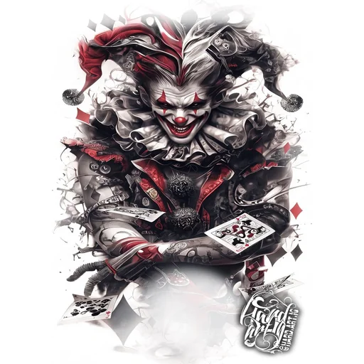 Um desenho de um palhaço com cartas de baralho, expressão assustadora, detalhes em vermelho e preto.