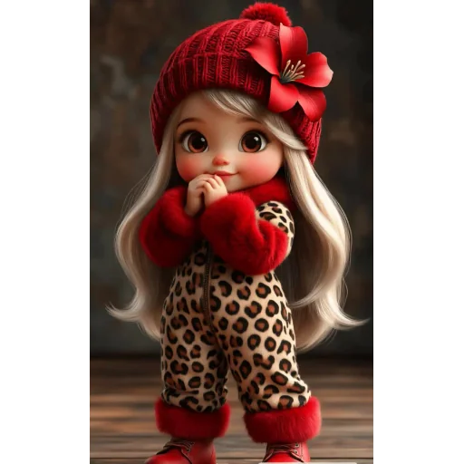 Menina de cabelos loiros com um chapéu vermelho e flor, usando uma roupa de leopardo com detalhes em vermelho.