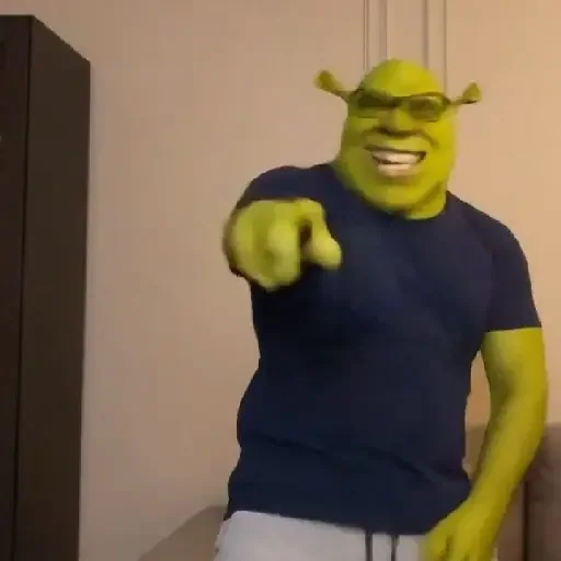 Shrek, um ogro verde, está apontando o dedo indicador para o espectador com um sorriso largo no rosto. Ele está vestindo óculos e uma camiseta azul escura.