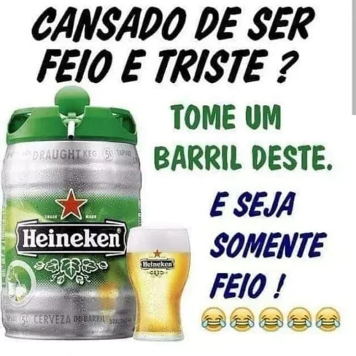 Uma lata de cerveja Heineken e um copo de cerveja com texto em preto, verde e azul. O texto diz 'CANSADO DE SER FEIO E TRISTE? TOME UM BARRIL DESTE. E SEJA SOMENTE FEIO!'