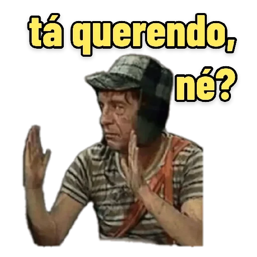 Homem com expressão de surpresa e dúvida, vestindo uma camisa listrada e um boné, com as mãos levantadas. O texto 'tá querendo, né?' aparece acima dele.
