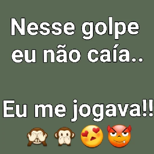 Um fundo verde escuro com texto em branco que diz 'Nesse golpe eu não caía.. Eu me jogava!!' e quatro emojis: um macaco de óculos, outro macaco, um rosto amarelo com coração nos olhos e um rosto laranja com chifres.