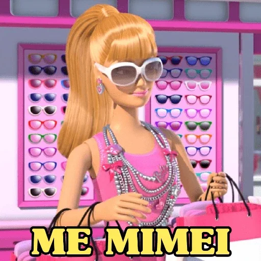 Uma personagem de anime com cabelo loiro e óculos de sol brancos sorri em frente a uma prateleira de óculos. Ela veste um top rosa com detalhes em prata e tem o texto 'ME MIMEI' em destaque.