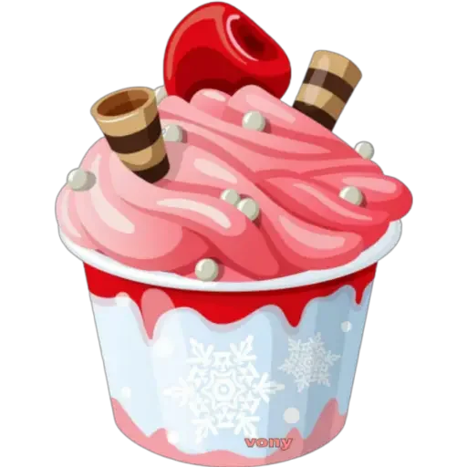 Um sorvete rosa em um copo com cobertura vermelha, decorado com confeitos e uma cereja no topo.