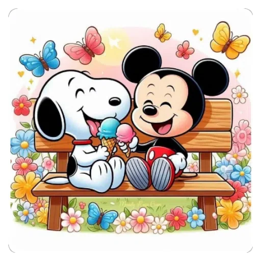 Snoopy e Mickey Mouse sentados em um banco, comendo sorvete e rodeados de borboletas e flores coloridas.
