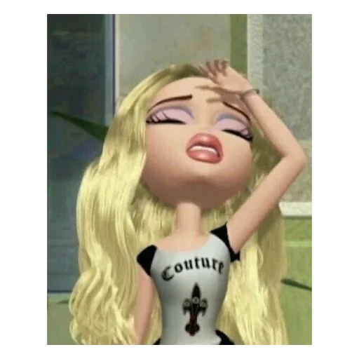 Uma personagem de anime com cabelo loiro e um vestido cinza com a palavra 'couture' e um símbolo preto. Ela parece exausta ou estressada, com a mão na testa.
