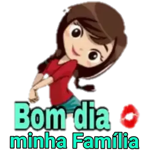 Uma menina de cabelos castanhos e olhos grandes sorri com um braço dobrado. Ela veste uma blusa vermelha e calça azul. Abaixo dela, está escrito 'Bom dia minha Família' em letras turquoise.