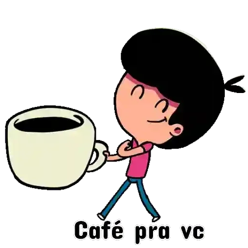 Uma menina de cabelo preto e rosa na testa, com uma camisa rosa e calça azul, sorri enquanto segura uma xícara de café. O texto 'Café pra vc' está escrito abaixo.