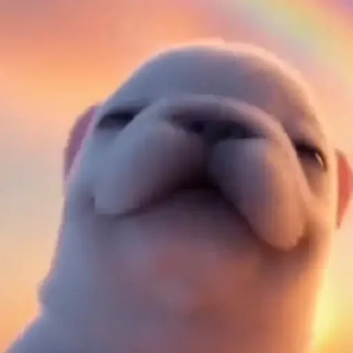 Rosto de um personagem de aparência fofa com focinho de animal, fundo laranja com arco-íris.