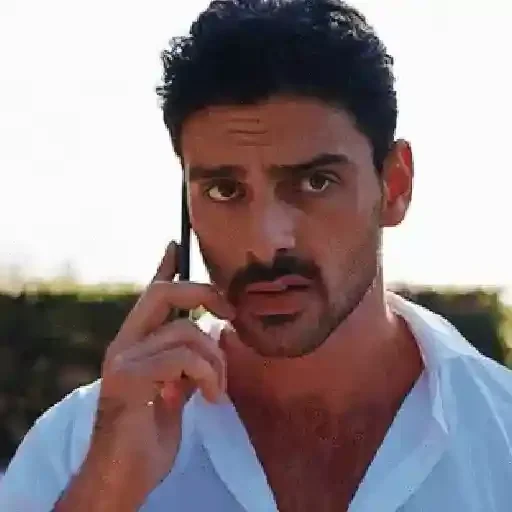 Homem de aparência confusa ao telefone, com uma expressão intrigada e uma mão levantada perto do ouvido, vestindo uma camisa branca.