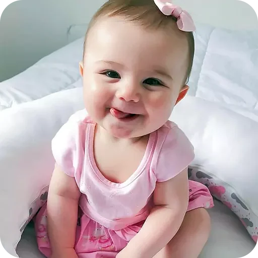 Bebê sorrindo com bochechas rosadas e laço rosa no cabelo, vestindo uma roupa rosa.