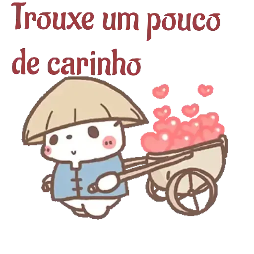 Um desenho de um animal fofinho com uma carinha feliz, vestindo um chapéu e uma roupa azul, empurrando uma carriola cheia de corações cor-de-rosa. A frase 'Trouxe um pouco de carinho' está escrita acima.