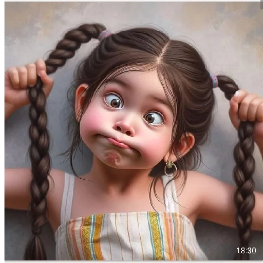 Menina com expressão surpresa, puxando duas tranças de cabelo castanho, vestindo uma camiseta listrada branca, amarela e laranja.