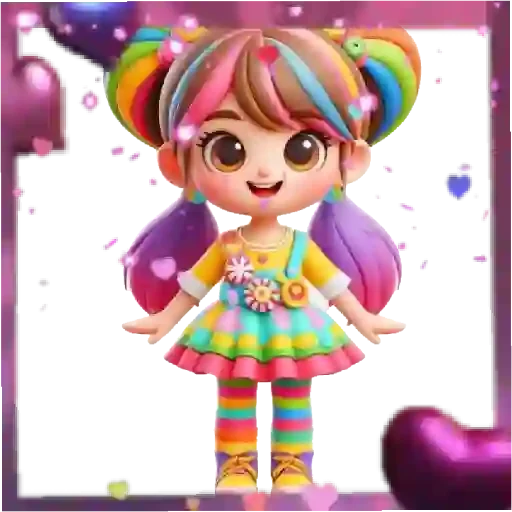 Uma menina de olhos castanhos com penteados coloridos em dois coques, vestindo uma roupa de cores arco-íris com flores e listras, em um fundo branco com coraçãozinhos e balões.