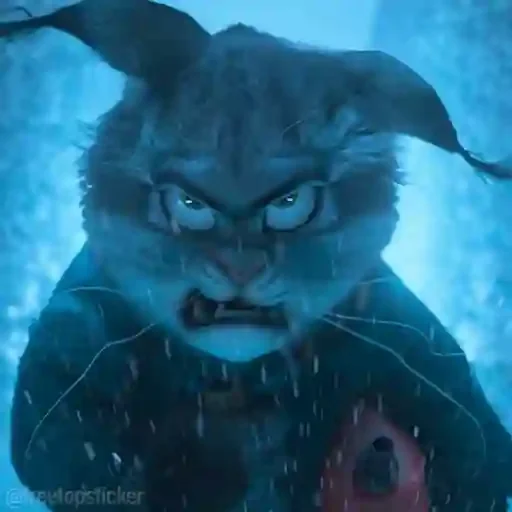 Um coelho cinza com orelhas grandes e olhos azuis, parecendo bravo ou assustado, com um fundo azul escuro e chuva. Ele está usando um casaco preto.