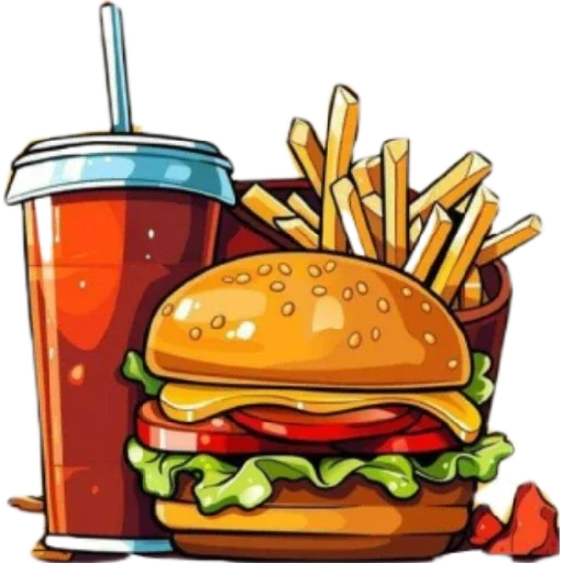 Um hambúrguer com queijo, alface e tomate, acompanhado de batata frita e um refrigerante em um copo alto com canudo.