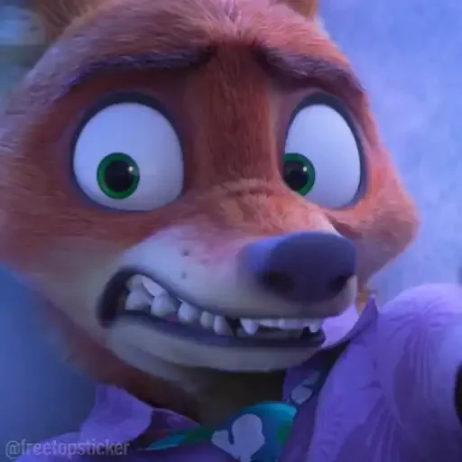 Rosto de raposa cartoon com expressão surpresa ou assustada, olhos arregalados e boca aberta, vestindo um colar.