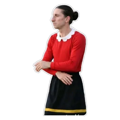 Uma mulher com o cabelo preso em um coque, vestindo um suéter vermelho com colarinho branco e uma saia preta com faixa amarela.