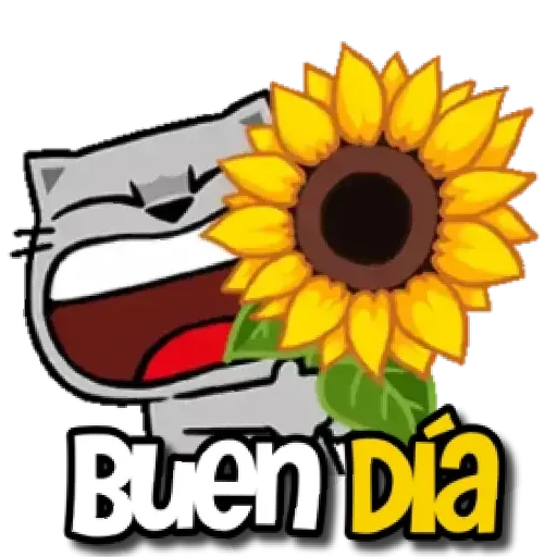 Um gato cinza com a boca aberta e um girassol na frente, com o texto 'Buen Día' embaixo.
