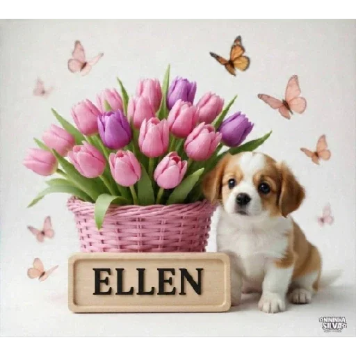 Um cachorrinho marrom e branco ao lado de uma cesta de tulipas cor-de-rosa e roxas, com uma plaquinha que diz 'ELLEN'. Borboletas cor-de-rosa e laranja pairam ao redor.